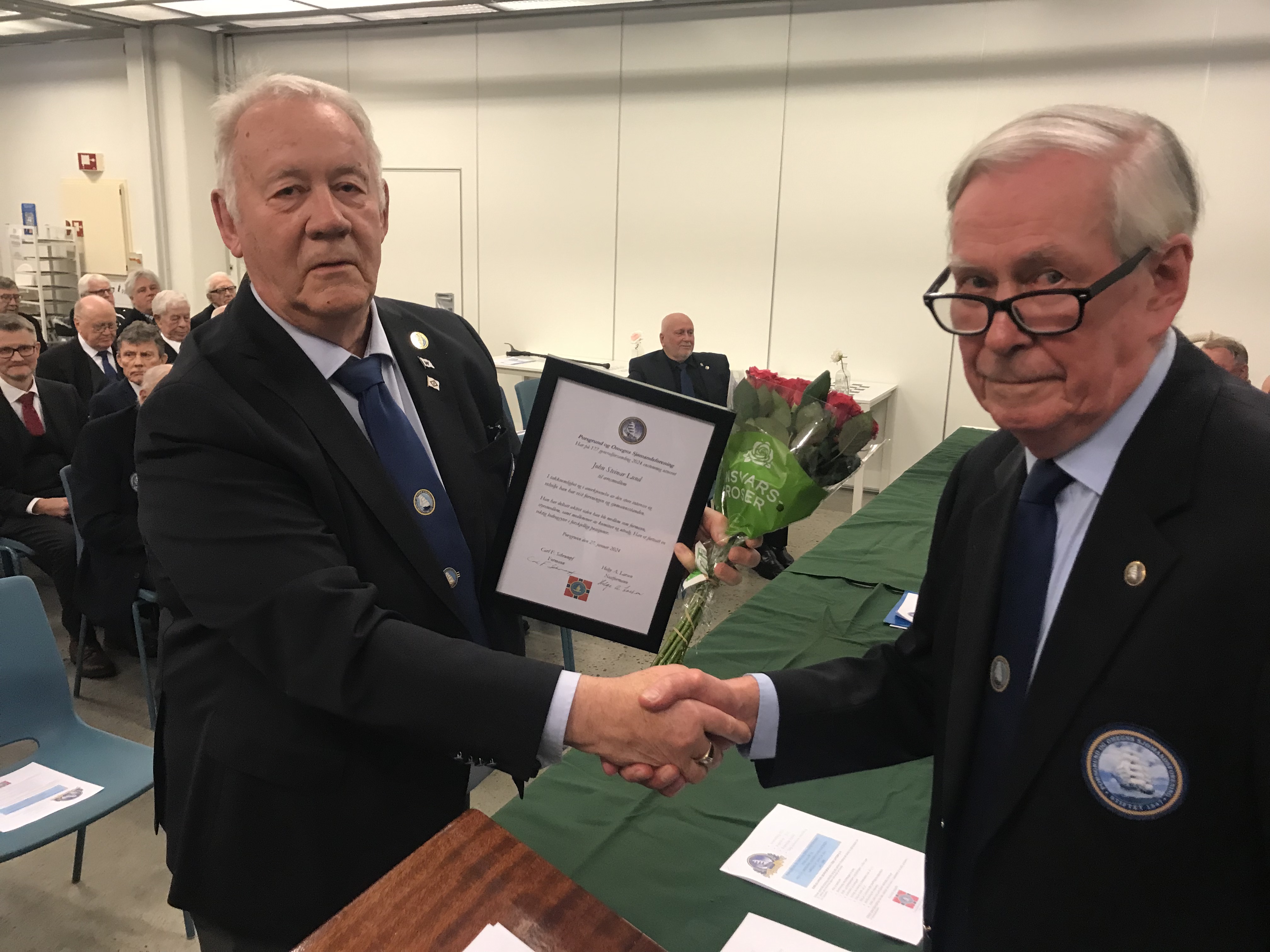 Våre to æresmedlemmer som er gått bort i 2023, Rolf Andersen og Bjørn A. Hansen, ble minnet med åtte glass på skipsklokken og ett minutts stillhet.