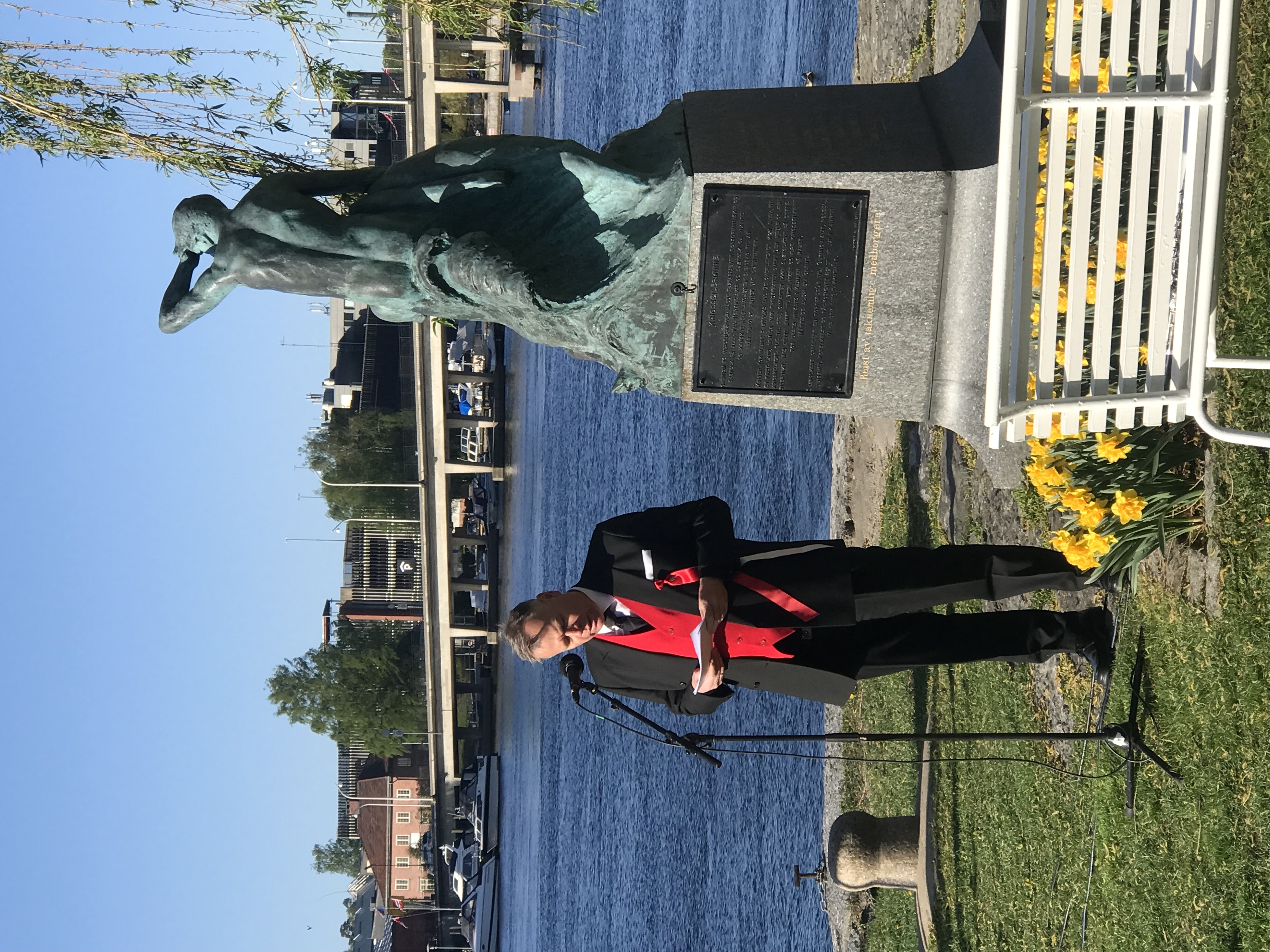 Formann i POS Carl F. Schrumpf holdt minnetalen og bekranset Sjømannsmunumentet Skibbrudd på Veste Dampskipsbrygge 8. mai.
